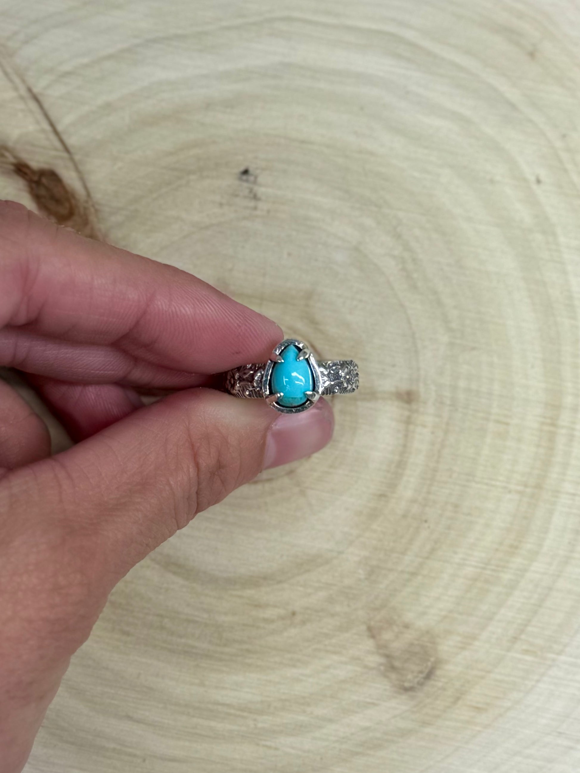 Bring a touch of bold Western elegance to your collection with this one-of-a-kind handcrafted ring. Featuring a vibrant Blue Mohave turquoise stone, securely held in a classic four-prong setting, this piece highlights the natural beauty of the stone while adding timeless strength and durability.