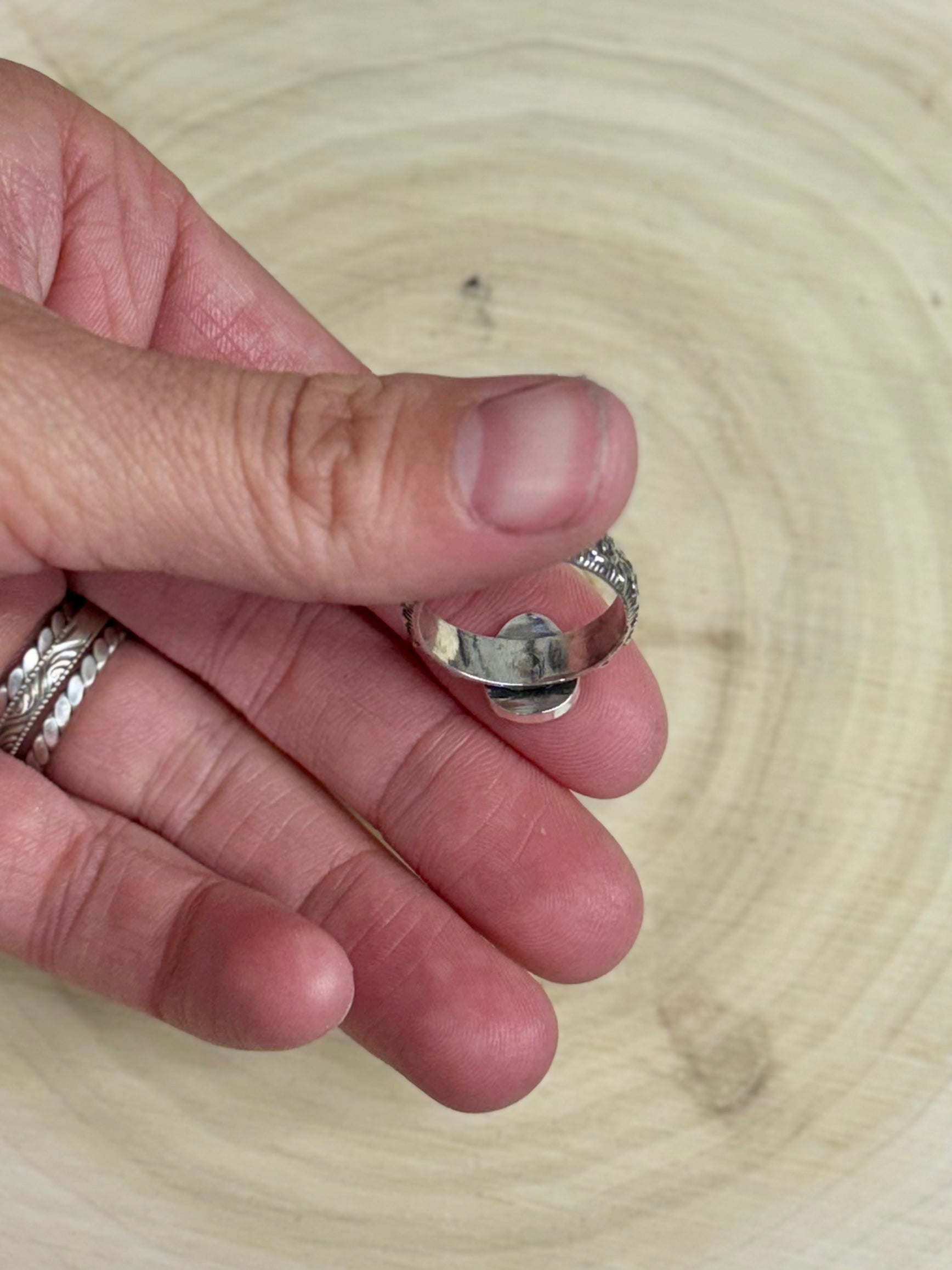 The ring is 925 sterling silver, the wide floral band and striking blue stone create a perfect balance of rustic charm and refined craftsmanship—an heirloom-quality piece meant to be cherished for years. Size 7