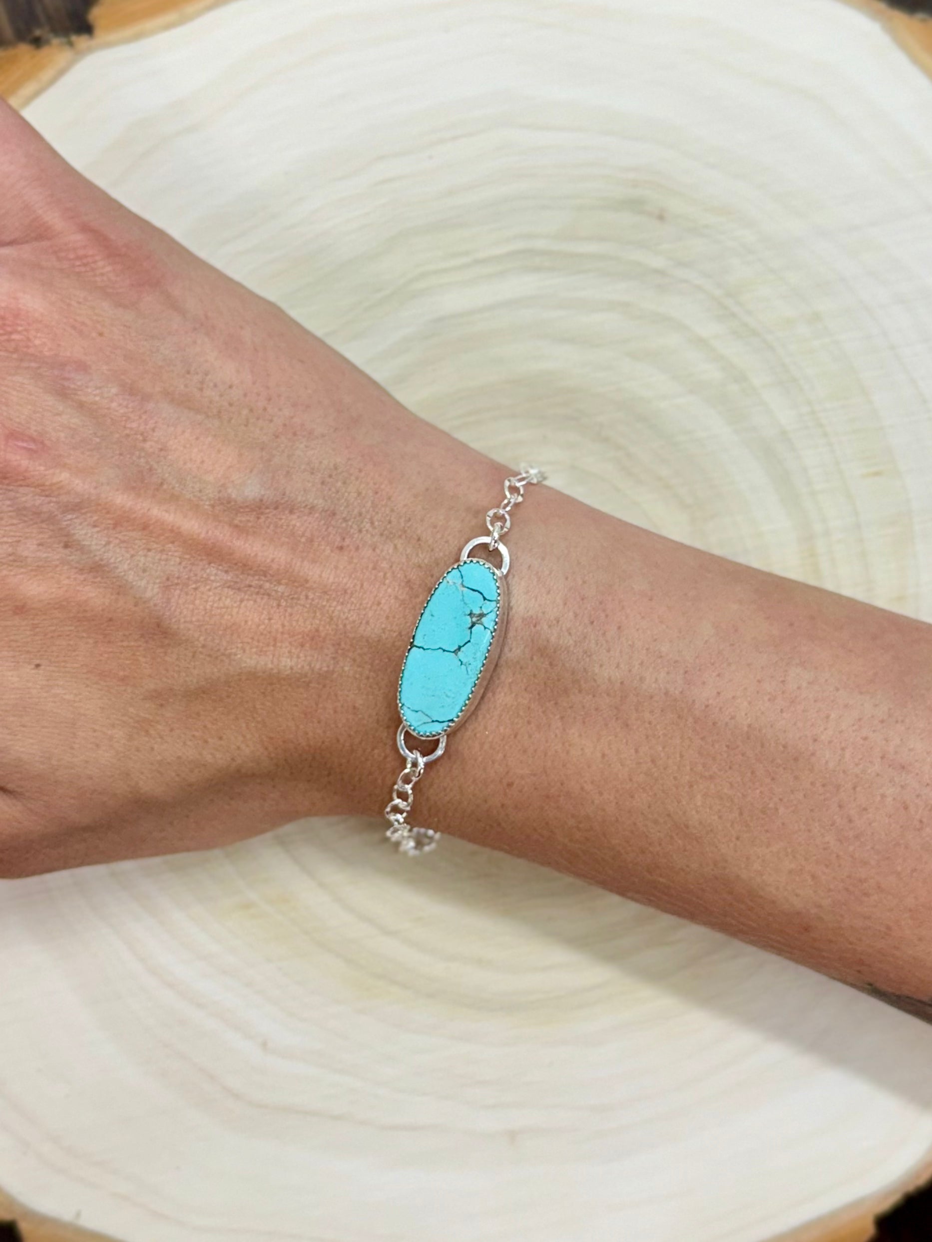 This beautiful 925 sterling silver chain bracelet features an oval shaped hubei turquoise stone set in fine silver. With loops connecting it to a dapped 925 sterling silver chain measuring 6" in length.