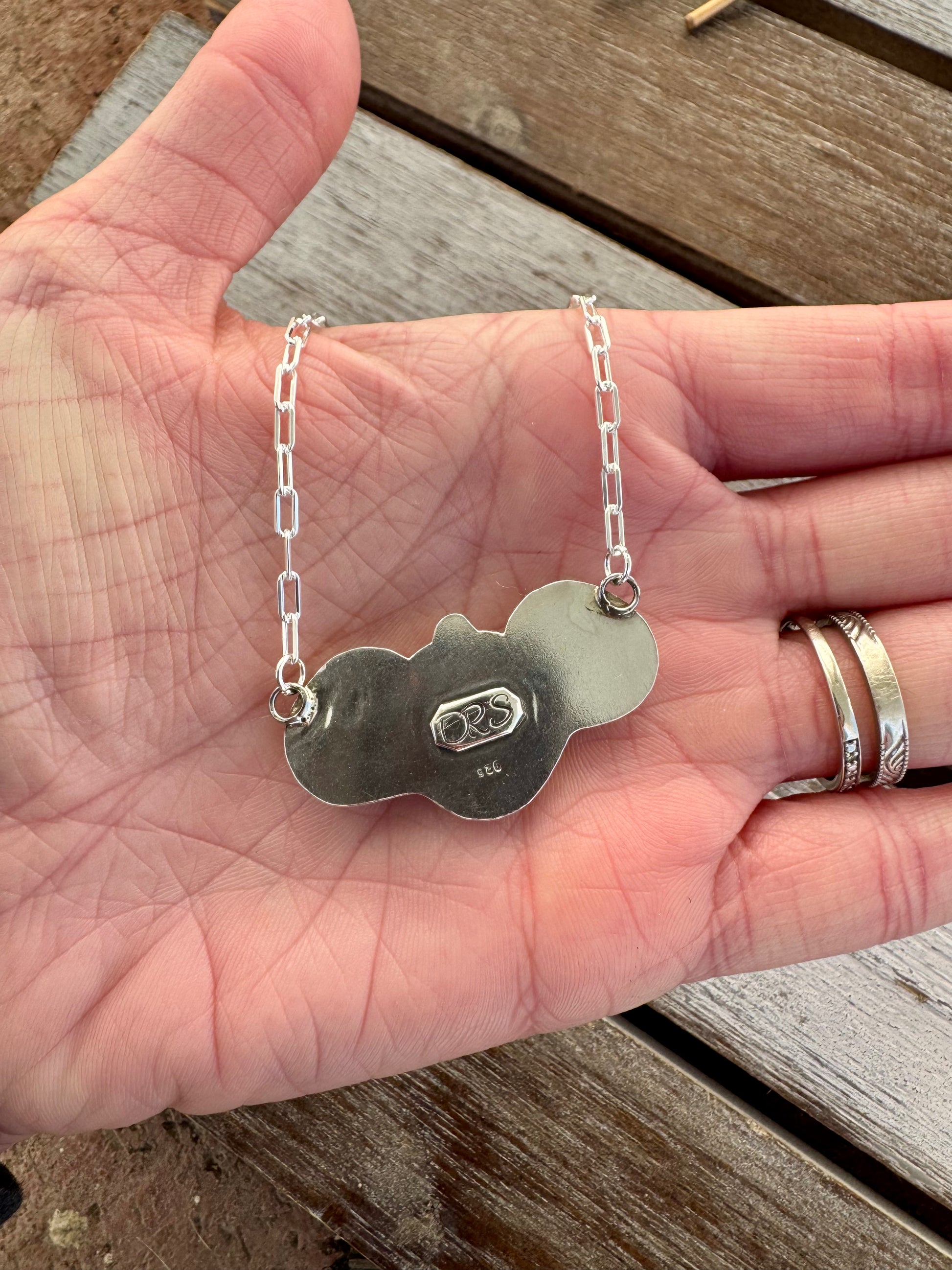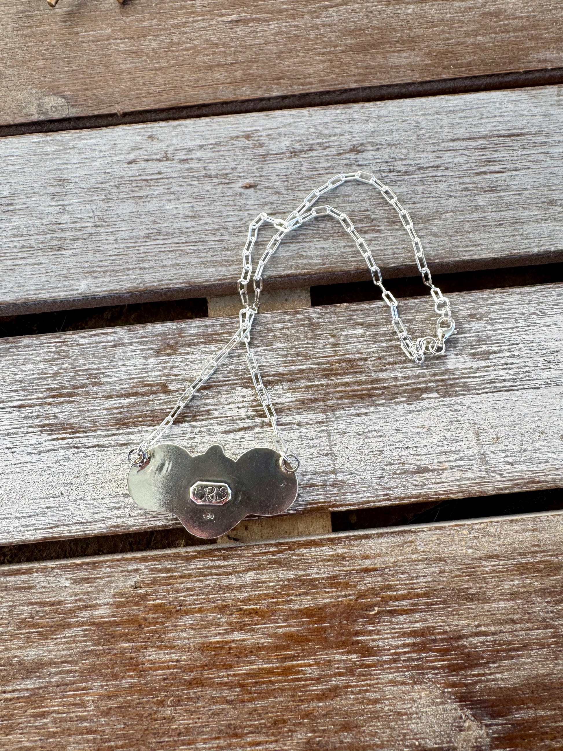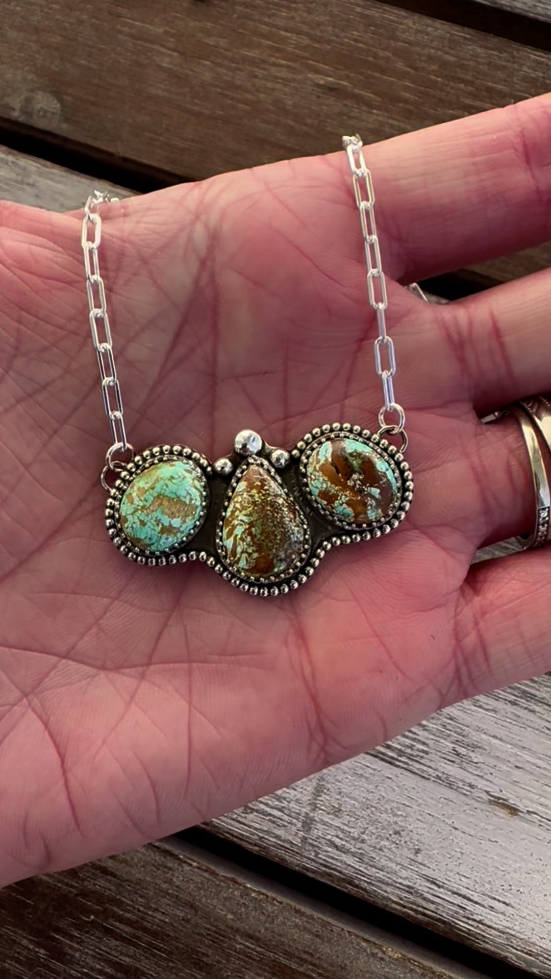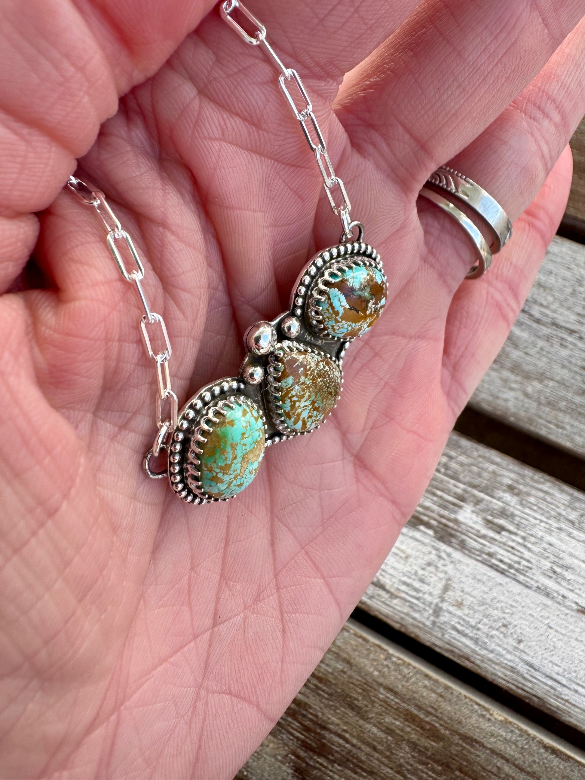 This stunning 925 sterling silver necklace features three kings manassa turquoise stones set in fine silver. With beaded border, and ball embellishments. This pendant hangs from a 12" paperclip 925 sterling silver chain for an almost choker like fit.