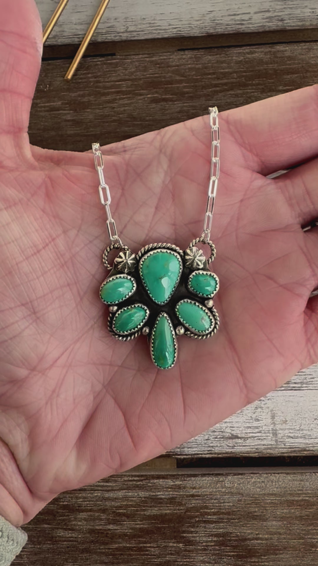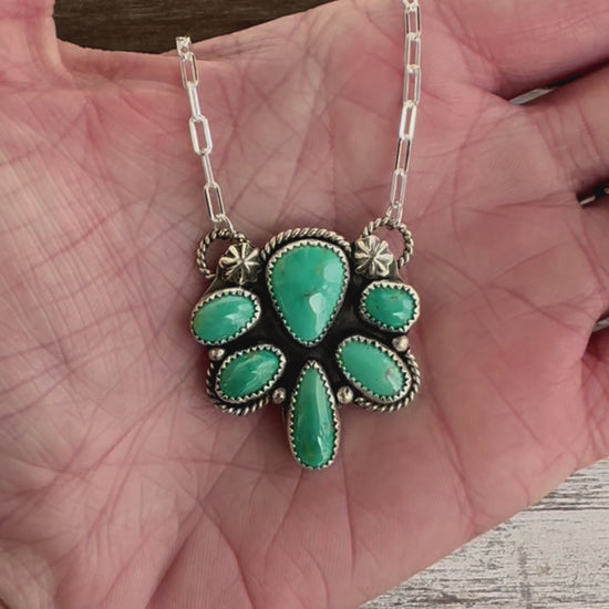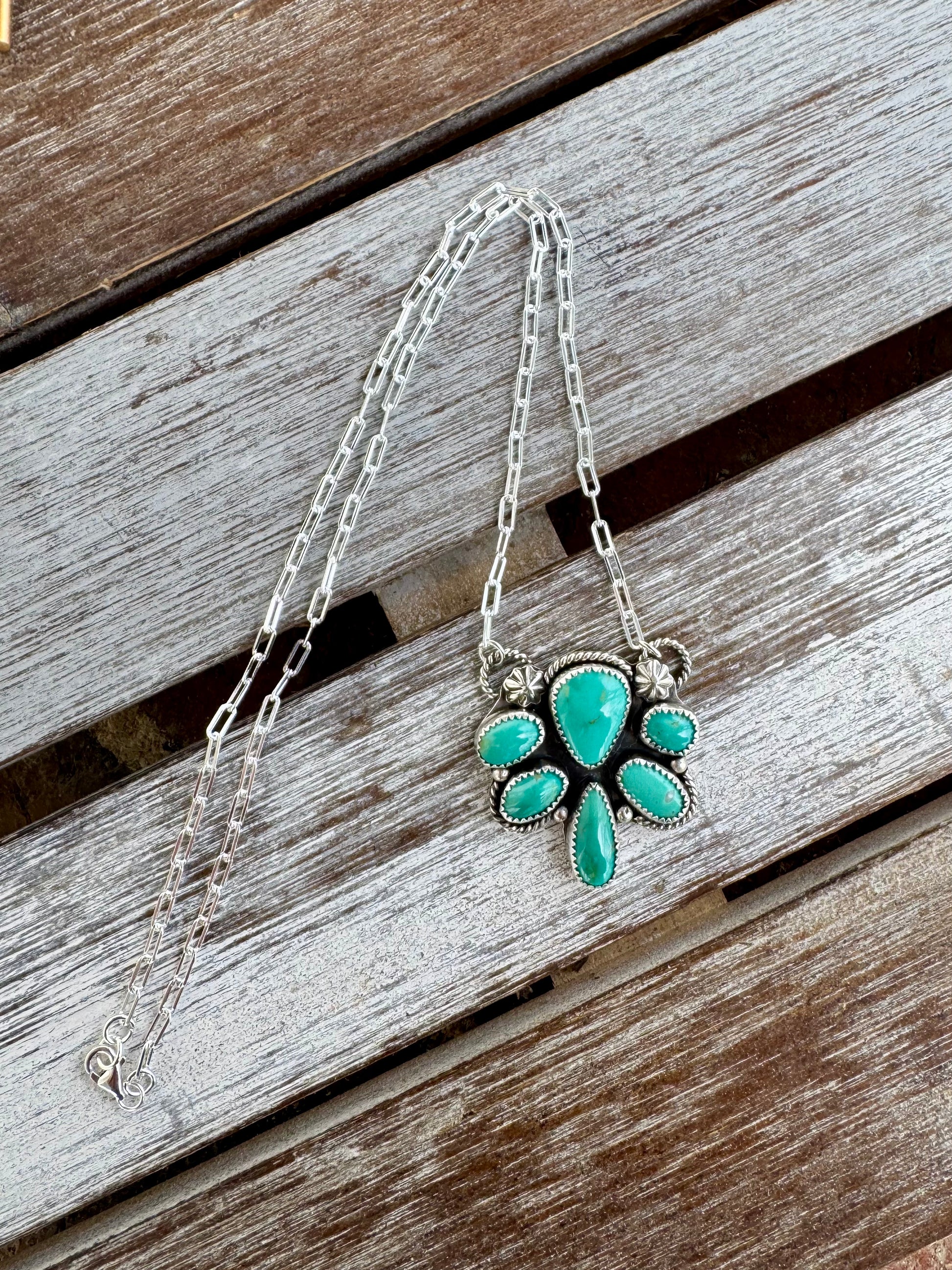 This unique 925 sterling silver statement necklace features six natural Nila turquoise stones set in fine silver. With two concho design, ball embellishments and rope detailing, this stunning piece hangs by a 18" 925 sterling silver paperclip chain.