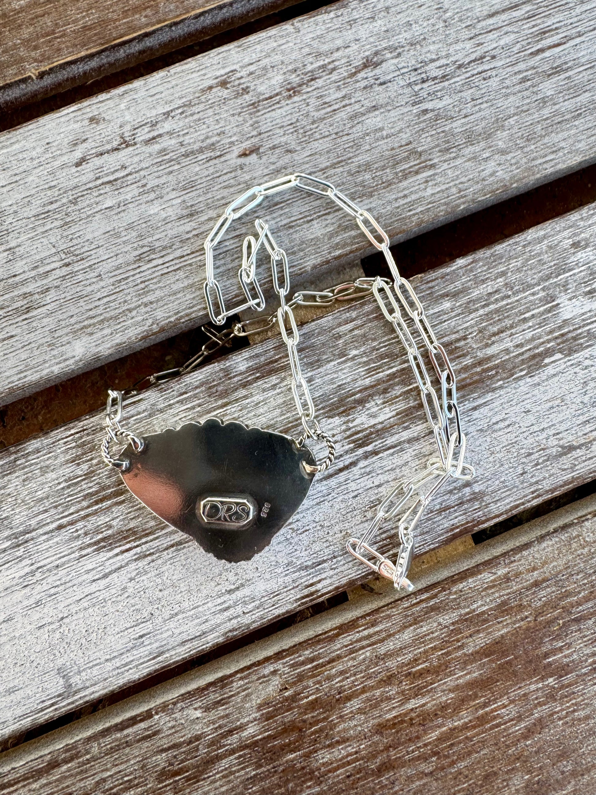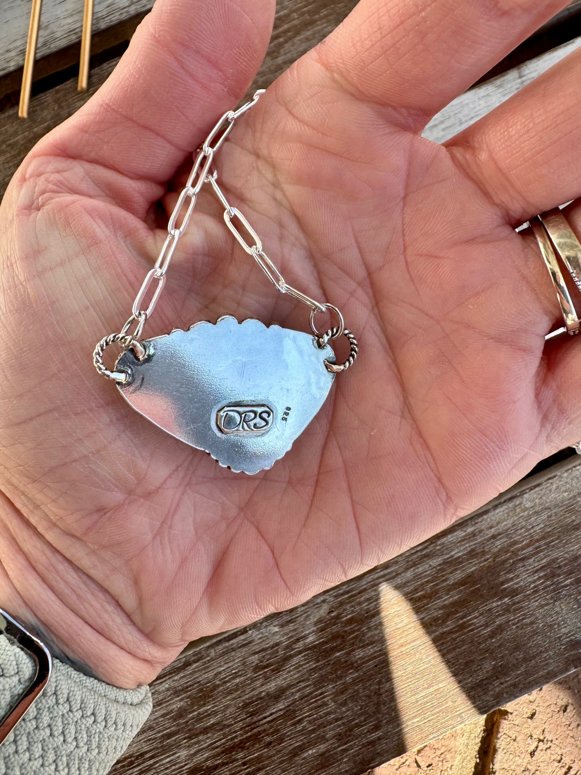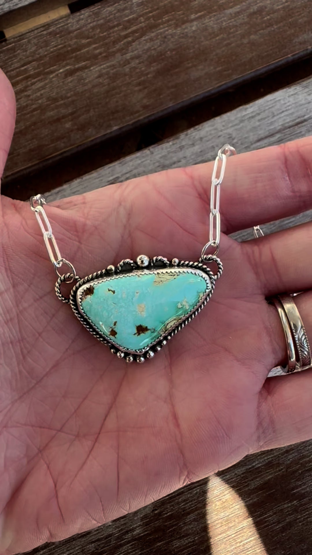 This gorgeous chunky 925 sterling silver necklace features a stunning triangular Royston Turquoise stone set in fine silver. With ball embellishments and a rope border, this pendant hangs from a 16" sterling silver paper clip chain.