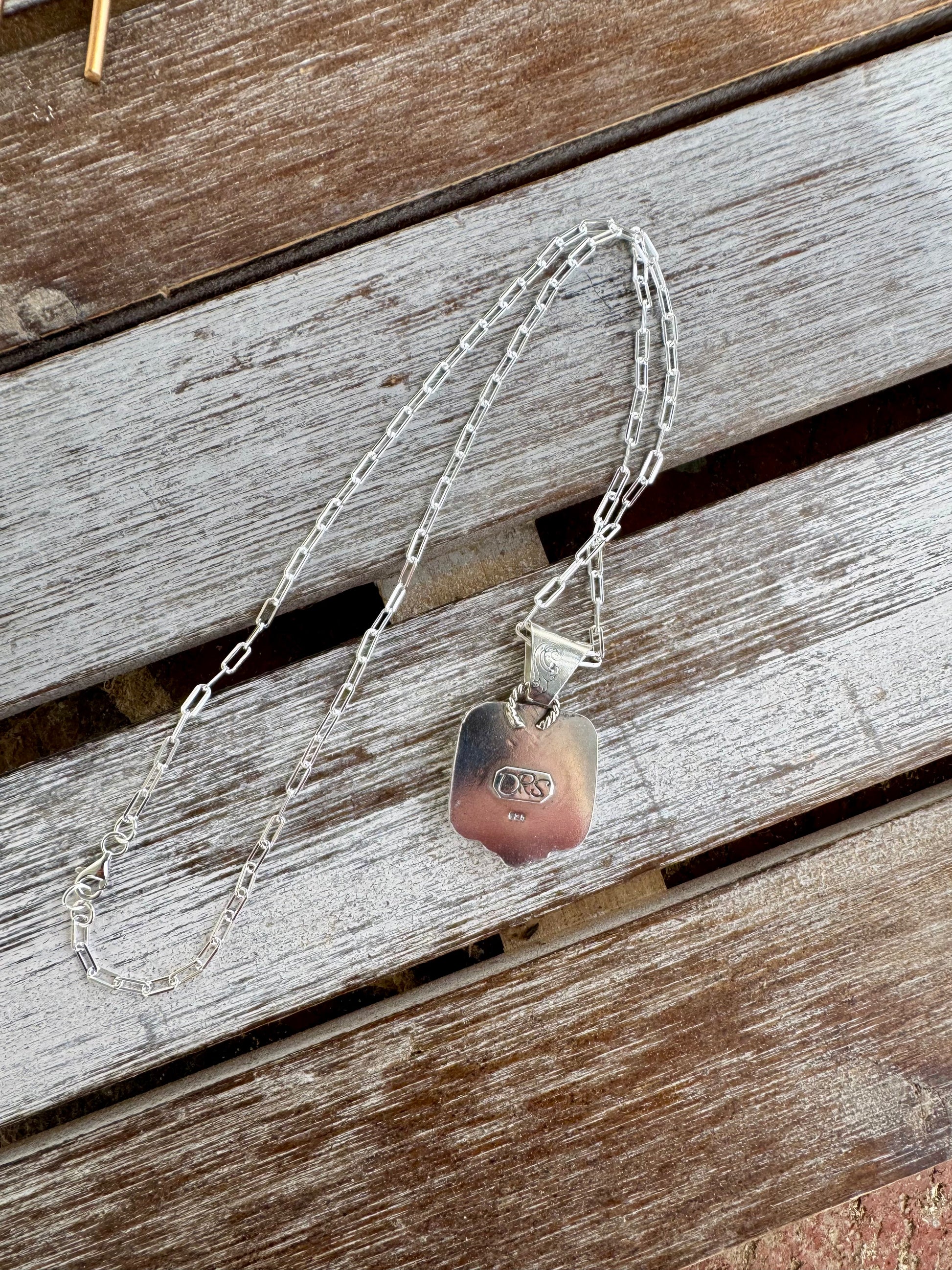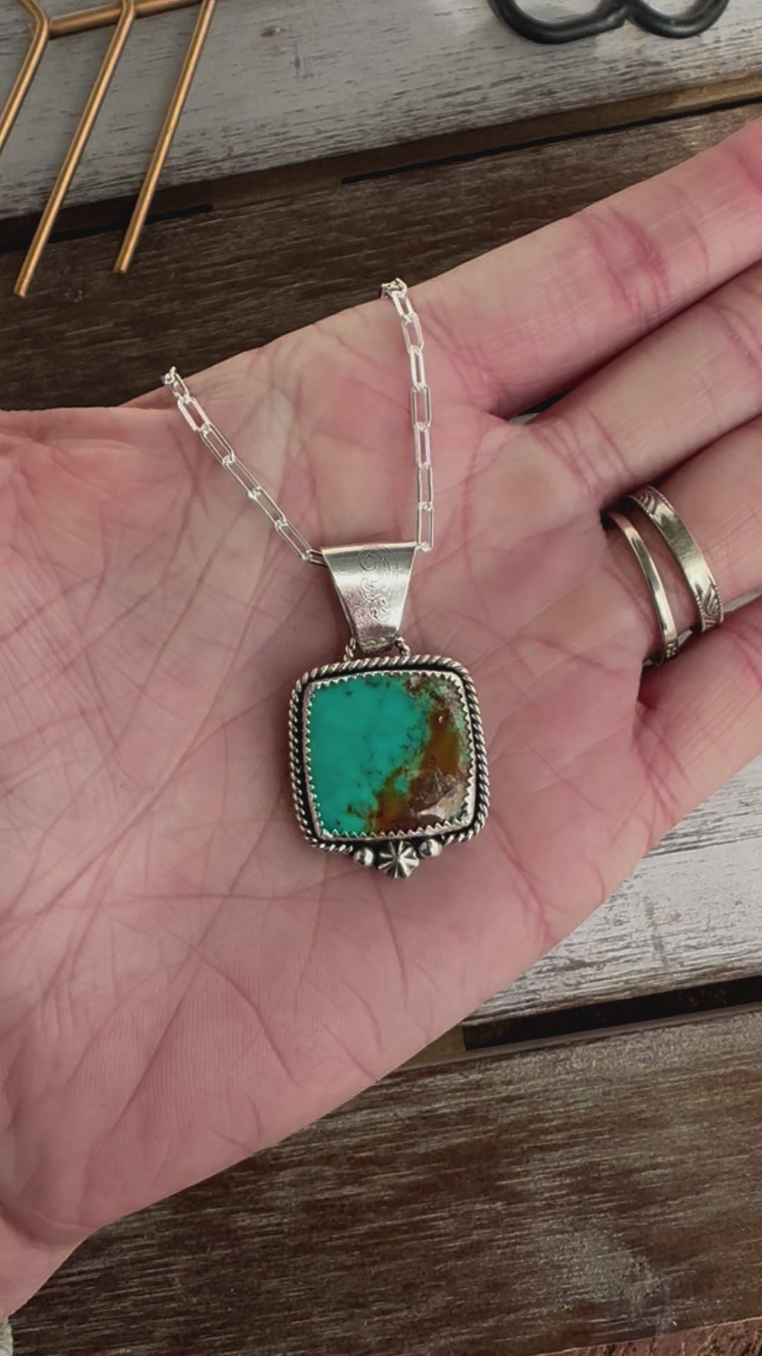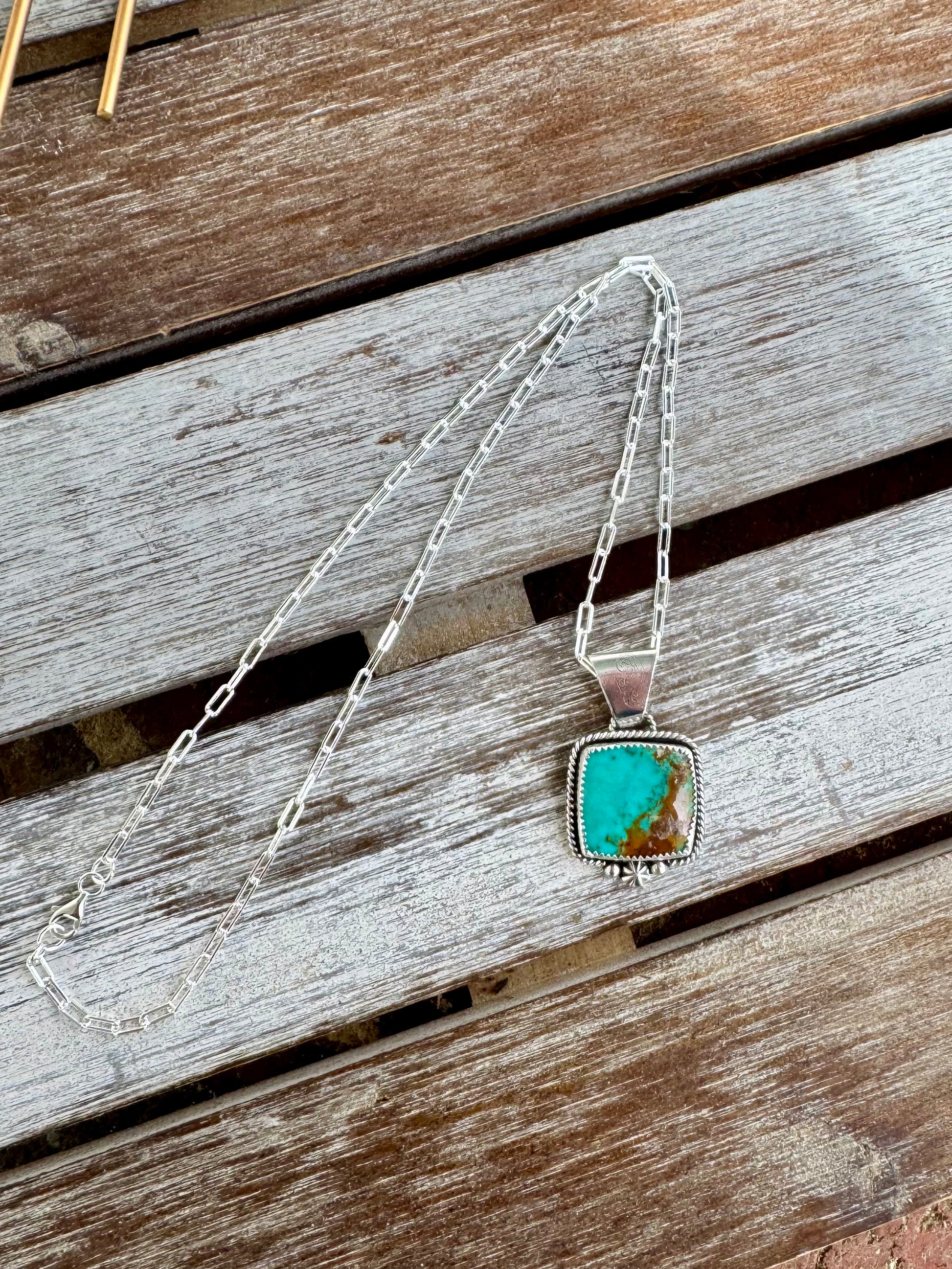 This beautiful 925 sterling silver necklace features a square natural turquoise mountain stone set in fine silver. With rope border, and concho/ball embellishments, this piece hangs from a 925 sterling silver 18" paper clip chain by a stamped bale.