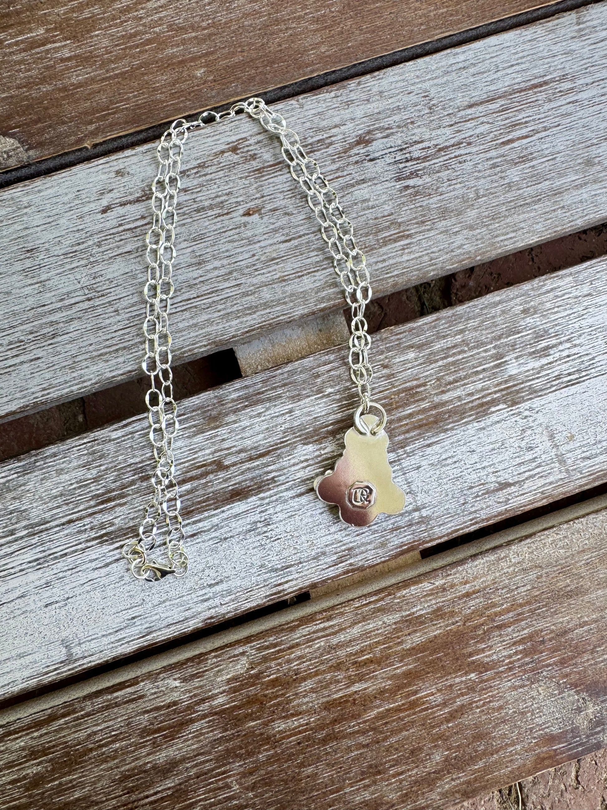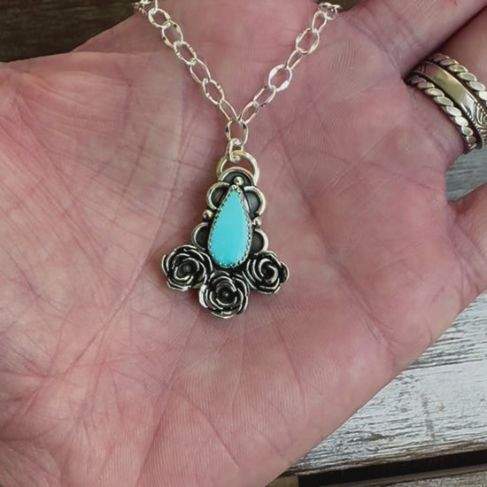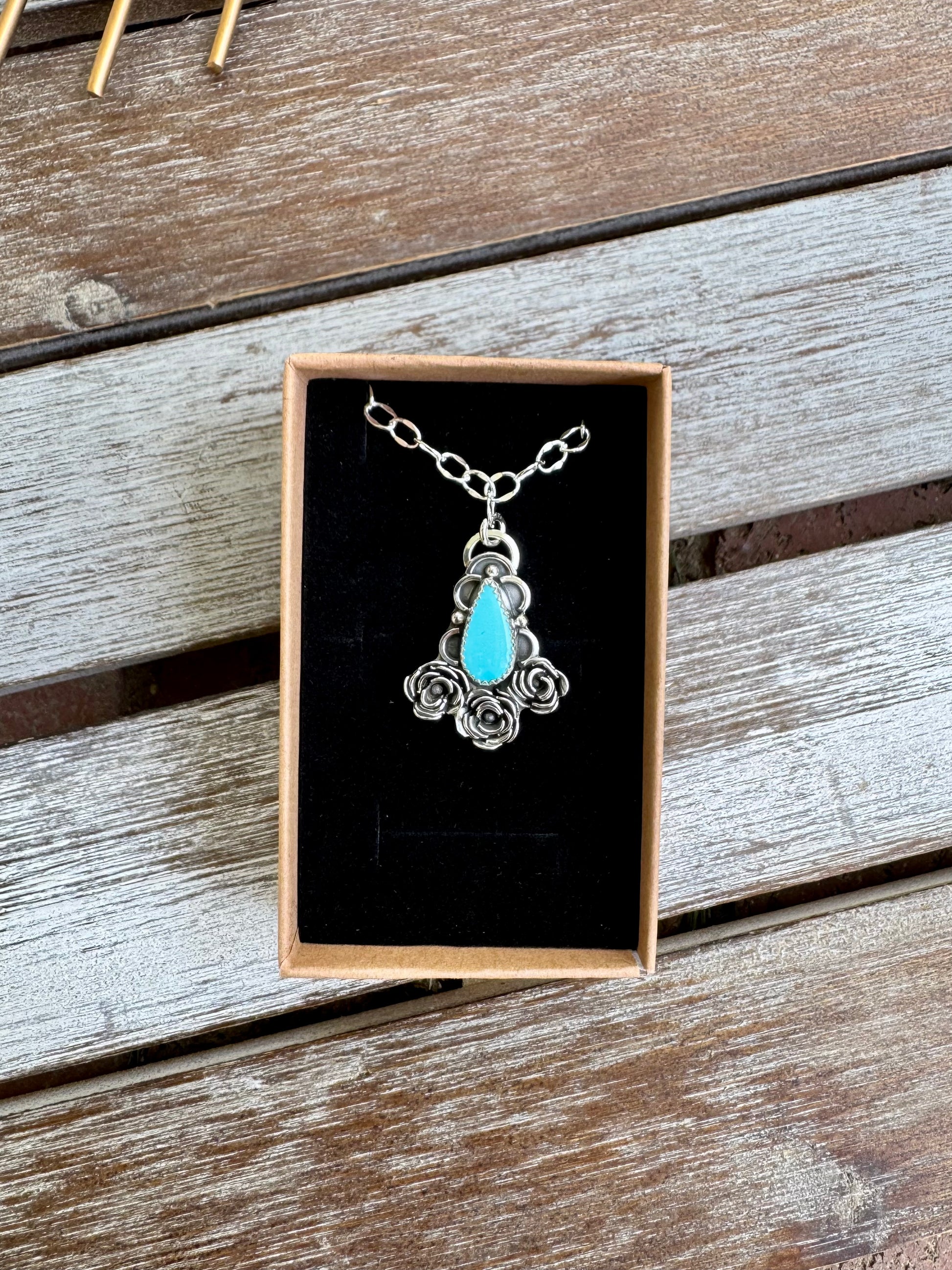 This beautifully unique 925 sterling silver necklace features a teardrop shaped sonoran turquoise stone set in fine silver. With hoop/ball border, and 3 handcrafted fine silver roses. This piece hangs from a 16" 925 sterling silver 3.9 mm dapped chain.